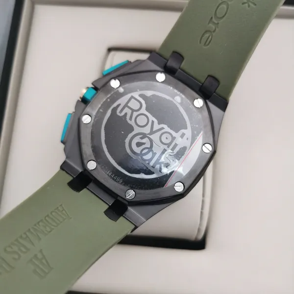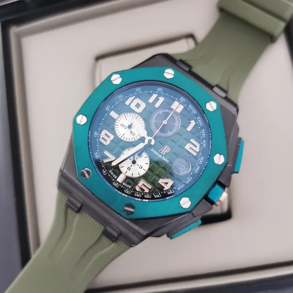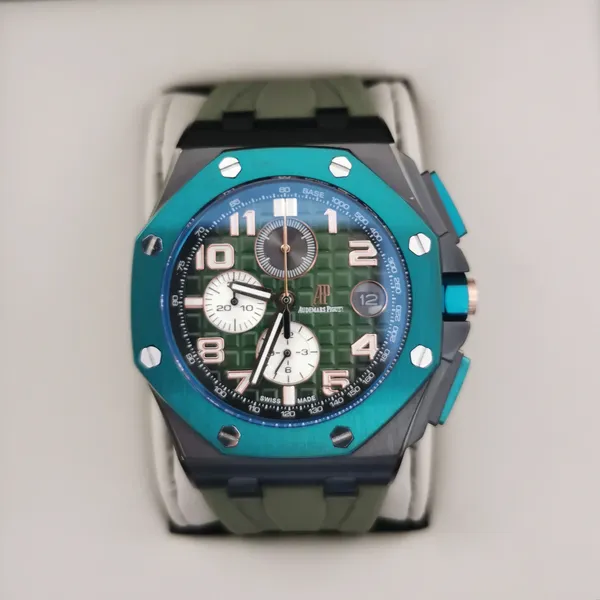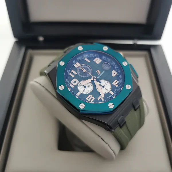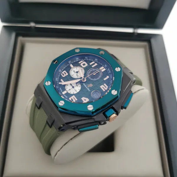 - Caixa: 44mm, com acabamento refinado e parafusos aparentes no bezel